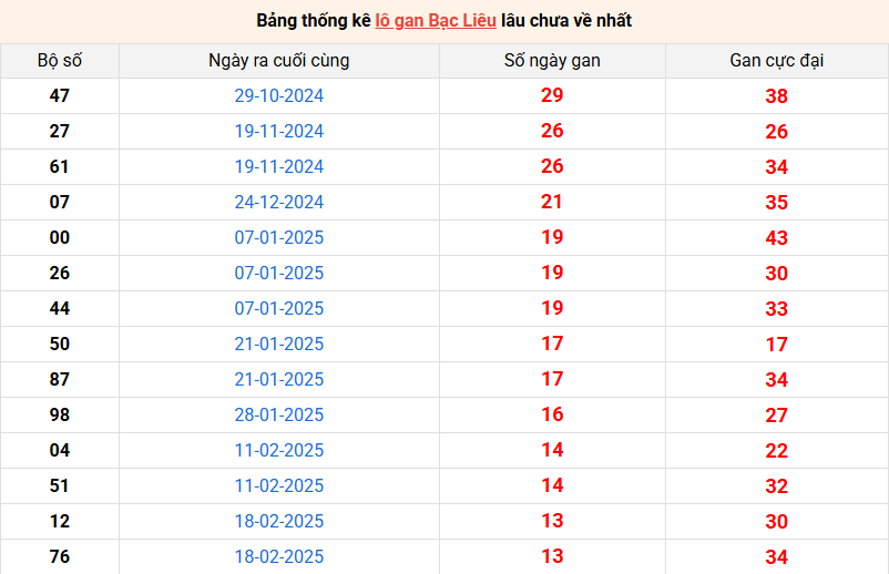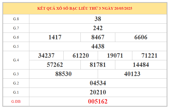 Trước khi đi vào tin tức chốt số phân tích Bạc Liêu 27/5/2025 mời anh em xem lại thống kê XSBL thứ 3 tuần trước chi tiết đầy đủ loto 2 số, lô 3 số dưới đây: